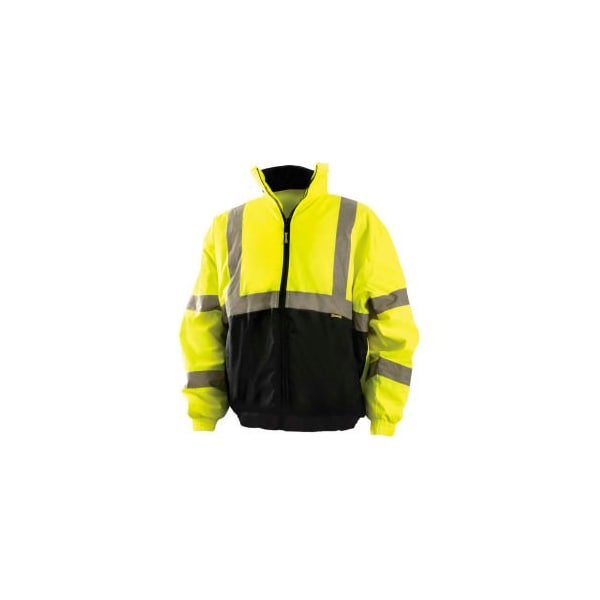 Value bomber jacket class 3 hi-vis yellow with black bottom s features: 2in silver reflective tape ansi 107 100% polyester 300 denier oxford with pu coating - waterproof with sealed seams quilted polyester lining for warmth & comfort fleece lined collar convenient roll-away hood with drawstring front zipper closure with inside storm flap astm f2732 temperature rated 46 f to -2 f 2 lower front pockets