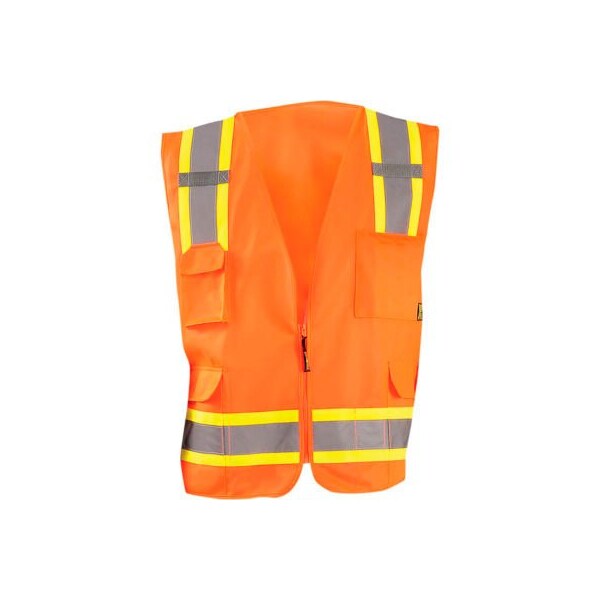 Value solid two-tone vest class 2 hi-vis orange 2xl styles that fit your work day, individual sizes and only the features you need and nothing you don't to get the job done. features: 2 silver reflective tape backed by contrasting ansi compliant trim. 100% ansi polyester tricot large arm opening for use over cold weather outerwear 2 mic tabs pockets: double left chest with 4 pencil compartments, right chest radio/phone with hook & loop flap, 2 lower front with flap hook & loop closure, 2 lower inside, & 1 inside flashlight