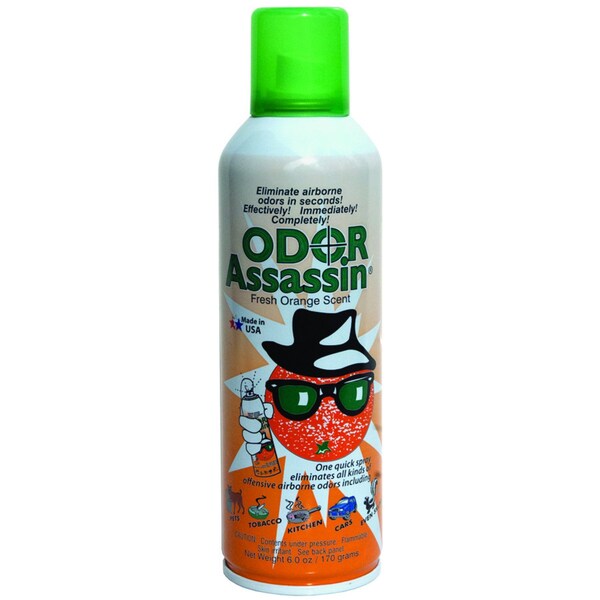 Odor Assassin gets rid of airborne odors in seconds! It's industrial strength formula and exceptional scents are effective at eliminating odors from your home or vehicle including bathroom and diaper odors, musty basement odors, cooking odors, pet odors, smoke odors, medical odors, trash odors, even skunk odors! Lab tests show that Odor Assassin eliminates more than 90% of odor molecules from the air. Compressed air is used as a natural propellant by Odor Assassin to dispense a continuous super-fine mist that lasts for hours - doesn't just cover up odors but assassinates them!