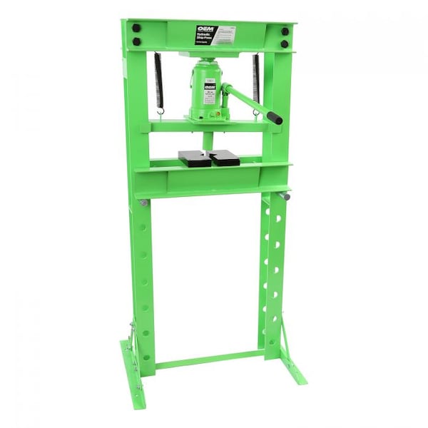 The OEMTOOLS 24810 20 Ton Bottle Jack Shop Press lets you remove and install bearings, gears, U-joints, bushings, ball joints and pulleys. Used for Parts Straightening, Bending and Pressing. Multi-Position Bed for Work Height Adjustment. Working Range: Max. Height (31.5"), Width (21.75"), Bed Opening (4.75")