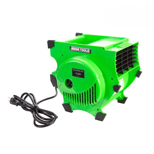 The OEMTOOLS Portable Mechanic's Blower Fan (1200 CFM) is a compact, portable blower great for use in shops, offices, homes, dormitories and other locations in need of high volume air circulation. 3-Speed Switch, 1200 CFM, For Indoor or Outdoor Use, 4-Position Feet, 8.5 Ft. SJTW 14AWG Cord (2) 11 Amp Grounded Receptacles with Over Current protection for Simultaneous Use with Other Power Tools and Accessories (Each Receptacle Produces 5.5 AMPS When Both are Plugged in), Max. Fan Amps: 13.5 Amps @120V/60Hz, Power Requirements: 120V 1.0A, Housing Material: Impact Resistant ABS