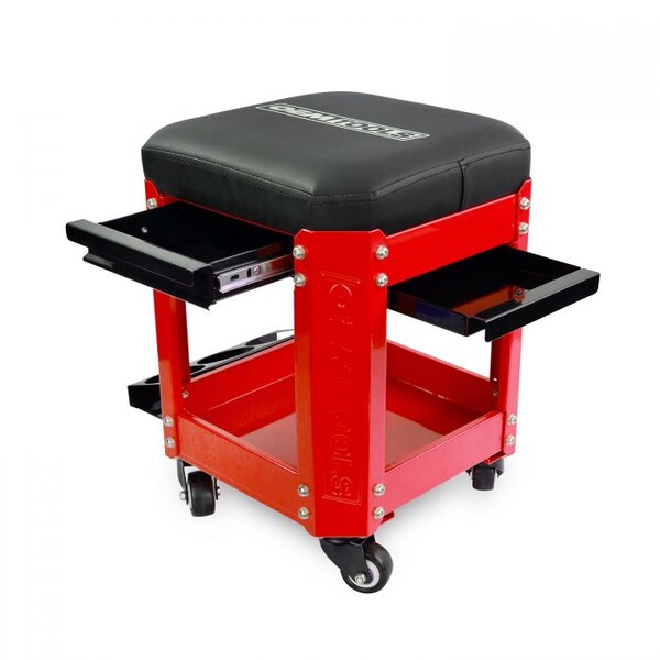 The Workshop Creeper Seat is a fully functioning seat with 2 tool tray drawers, allowing you to keep everything you need close at hand. It can hold up to 286 lbs. in weight, and features a 3-can holder for keeping your spray cans or drink cans close at hand. Four swivel wheels roll smoothly across the floor with easy turning for maximum maneuverability. Vinyl Foam Padded Seat for Maximum Comfort. 2 Sliding Drawers to Store Parts. Under Seat Storage for Tools, Parts & Accessories. Can Holder for 3 Cans. Smooth Rolling Swivel Caster Wheels. Weight Capacity: 280 Lb.