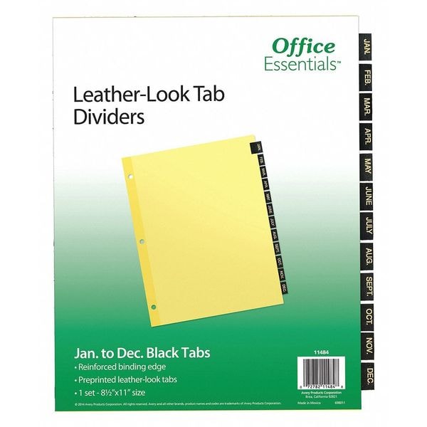 Binder Divider, Index Tab Type Preprinted Tabs, Tab Message Jan to Dec Tabs, Index Tab Color Black, Divider Color Buff, Number of Tabs 12, Width 8 1/2 in, Height 11 in, Tab Cuts Visible 12, Thickness 0.007 mil, Material Paper, For Use With 3-Ring Binders, Index Tabs