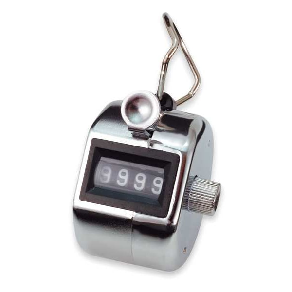 Mechanical Tally Counter, Input Type Hand Operated, Number of Digits 4, Mounting Hand Held, Height 1.5 in, Depth 2 in, Width 2 in, Display White Digits, Black Background, Reset Type Push Button, Color Silver
