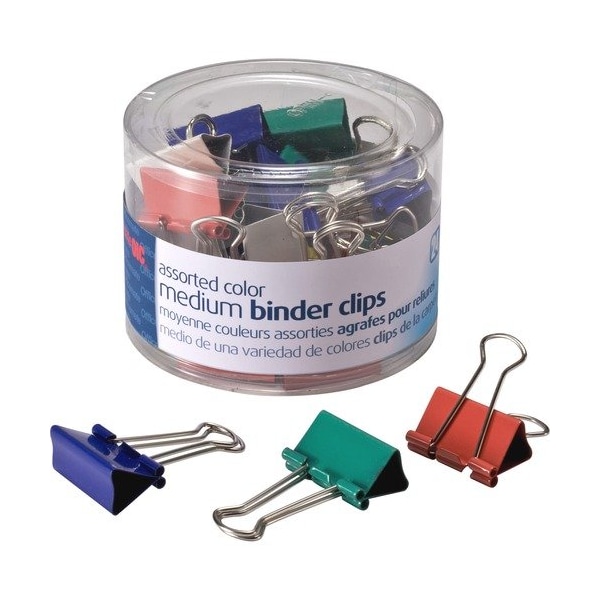 Metal binder clips in assorted colors for easy color coding. Handy tub for storage. Clip/Clamp Type: Binder Clips, Clip/Clamp Trade Size: Medium, Clip/Clamp Materials: Metal Clip/Steel Wire, Clip/Clamp Colors: Assorted.