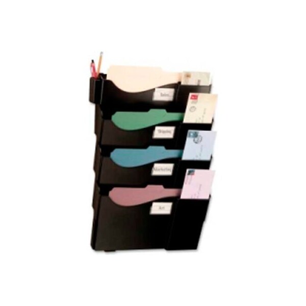 four-pocket filing system includes a starter pocket plus three add-on pockets. Design features slots for envelopes or postcards and a detachable cup (fits on either side). Mount to walls easily with included mounting hardware. Labels for categorizing files are included.