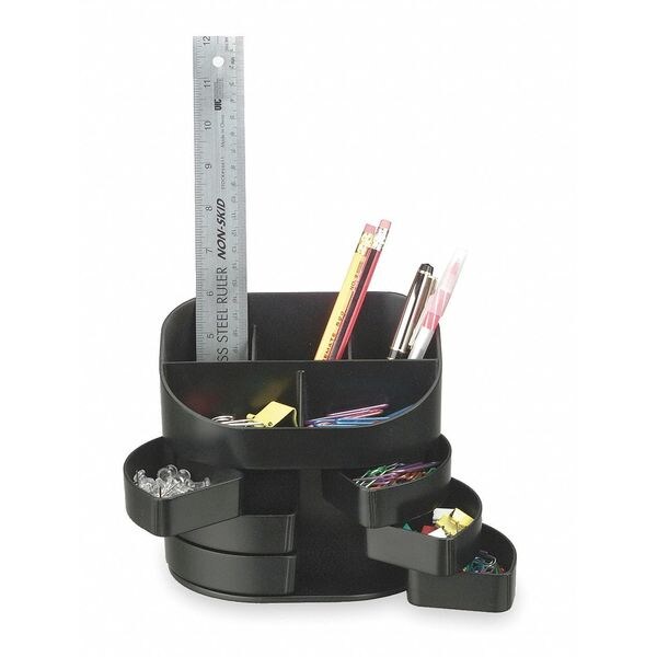 Desk Supply Organizer, Number of Compartments 11, Black, Plastic, Height 5 3/4 in, Width 6 1/2 in, Includes (6) Swing-Out compartments, (2) Shallow Compartments, (3) Deep Compartments