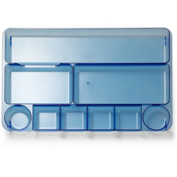 Drawer tray keeps all of your supplies organized and out of view. It fits in your drawer or can sit on your desk to organize any home or office drawer. Blue Glacier Drawer Tray features nine compartments in various sizes to store various items. It is made of molded plastic.