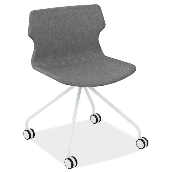 Unique curved back design|Spider style white metal base with casters|Two beautiful upholstery options, Teal or Gray