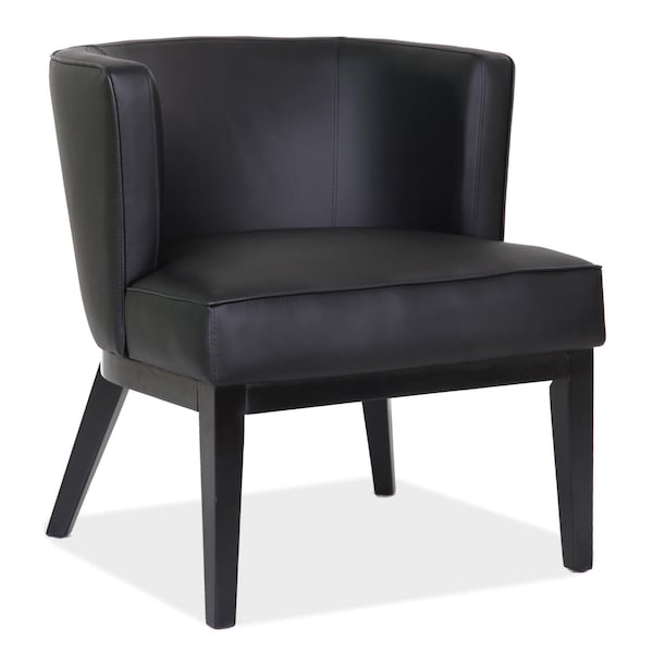 Guest and reception chair with fashionable accent and barrel cushion design. Covered in an ultra soft and durable Leather-Soft Vinyl. Extra large padded seat for extra comfort. Black accented wood legs.