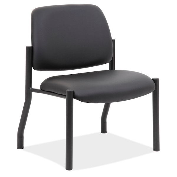 Armless big tall guest chair rated at 400 pounds. Covered in a black antimicrobial vinyl with a waterfall seat design. Constructed with a steel frame and black tubular legs with a wall saver design and self leveling back legs.