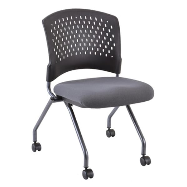 The Armless Nesting Chair with Casters features chairs with a titanium frame and fabric seats. It comes in a variety of upholstery colors.