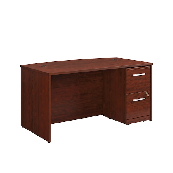 Command the room with the elevated and professional look of this executive office bundle from the Affirm collection. A durable, 1'' thick top gives this bowfront executive desk a large amount of surface space while providing a substantial design element. The resilient melamine top is heat, stain, and scratch-resistant with impact-resistant, high-grade thermoplastic edges, ensuring the commercial office desk will withstand the hardest days' work. This 60-inch desk has a cord management system with two desktop grommet holes to help keep the workspace tidy and adjustable base levelers to ensure a steady surface, even over uneven flooring. The 2-drawer pedestal file cabinet comes fully assembled, with minimal hardware attachment required, and includes an interlocking mechanism that allows only one drawer to open at once. Important documents are secure and organized with two locking drawers operating on full extension slides that hold letter or European-size hanging files. For the easiest mobility, this mobile file cabinet includes hidden casters as well. Finished on all sides in Classic Cherry, this bundled executive desk and pedestal file cabinet adds storage space while offering exceptional style and durability of commercial office furniture.