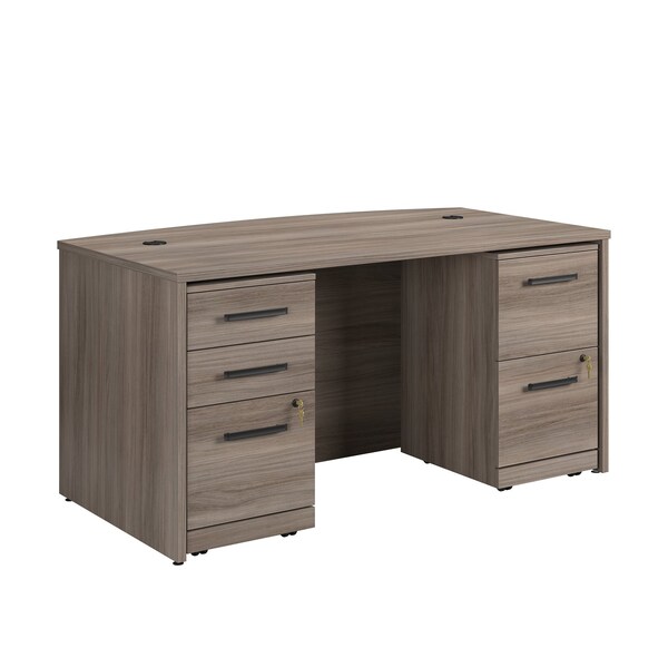 For an office upgrade that includes a double pedestal executive desk, look no further than the sharp design of the bowfront executive desk bundle from the Affirm collection. This 60-inch desk features a spacious melamine surface that is heat, stain, and scratch resistant with impact-resistant, high-grade thermoplastic edges to withstand the toughest of planning sessions. A cord management system with two desktop grommet holes allows for a convenient path for cords to keep the desk clutter-free. Adjustable levelers ensure an even placement on the most uneven terrain. The two accompanying filing cabinets come fully assembled, with minimal hardware attachment required Hidden casters provide easy movement around the office. The mobile file cabinets also include an interlocking mechanism that allows only one drawer to open at once, for added safety. The 3-drawer pedestal file cabinet has two small drawers with metal runners and safety stops and a locking, lower file drawer with full extension slides. The 2-drawer pedestal file cabinet has two locking file drawers to ensure that important documents are secure and organized. , All file drawers on each pedestal cabinet hold letter or European-size hanging files. Finished on all sides in the cool, gray tones of Hudson Elm, this commercial office desk trio will inspire motivation to finish those major projects!