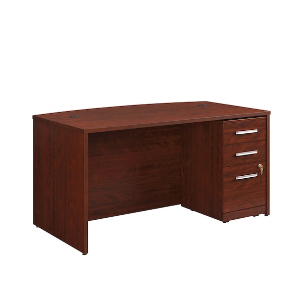 Command the room with the elevated and professional look of this executive commercial office bundle from the Affirm collection. A durable, 1'' thick top gives this bowfront executive desk a large amount of surface space while providing a substantial design element. The resilient melamine top is heat, stain, and scratch-resistant with impact-resistant, high-grade thermoplastic edges, ensuring the commercial office desk will withstand the hardest days' work. This 60-inch desk has a cord management system with two desktop grommet holes to help keep the workspace tidy and adjustable base levelers to ensure a steady surface, even over uneven flooring. The accompanying 3-drawer pedestal file cabinet comes fully assembled, with minimal hardware attachment required, and includes hidden casters for easy movement around the office. Two small drawers with metal runners and safety stops are ideal for storing office essentials. The pedestal file cabinet has a locking, lower drawer with full extension slides that hold letter or European-size hanging files and includes an interlocking safety mechanism to prevent all drawers from opening at once and tipping. Finished in Classic Cherry, this mobile file cabinet creates an executive office desk with storage options - providing the ultimate in style and function.