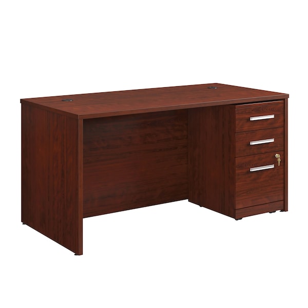For a commercial office desk that is ready to take on the toughest of jobs, look no further than this commercial office desk with storage bundle from the Affirm collection. A durable, 1'' thick melamine desktop is heat, stain, and scratch-resistant, with impact-resistant, high-grade thermoplastic edges ensuring your commercial desk will withstand everyday wear and tear. This 60-inch desk includes a cord management system with two desktop grommet holes to ensure a tidy and clutter-free workspace. Adjustable levelers ensure the 60'' x 30'' desk is at the correct angle, especially over uneven flooring. The accompanying 3-drawer pedestal file cabinet comes fully assembled, with minimal hardware attachment required. Two small drawers with metal runners and safety stops are ideal for storing office essentials. A locking, lower drawer with full extension slides holds letter or European-size hanging files. This file pedestal includes an interlocking safety mechanism that prevents all drawers from opening at once. For use as a mobile file cabinet, it includes hidden casters for easy movement around the office. Finished on all sides in Classic Cherry, this commercial office bundle offers the perfect amount of multifunctionality while remaining stylish.
