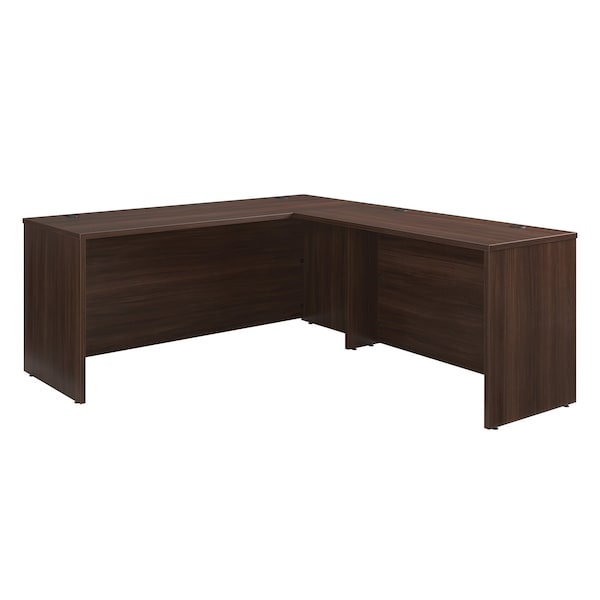 This business desk bundle from the Affirm collection is the very essence of office productivity. This L-desk is constructed with a durable, 1'' thick top surface large enough to hold a desktop computer, laptop, file organizers, and more. The 72-inch desk can be fastened to the left or right side of the 48-inch desk return to create an L-shaped configuration and a completed look. A sturdy, melamine top surface is heat, stain, and scratch resistant, ensuring this commercial office bundle can endure the rigors of the everyday office grind. This commercial desk includes a cord management system with a total of four desktop grommet holes. Adjustable base levelers are included on this melamine office desk to ensure optimal office ergonomics and alignment, especially over uneven flooring. Finished in the warm chocolate brown tones of Noble Elm, this 72'' x 72'' computer desk is a foundation for nearly any office configuration.