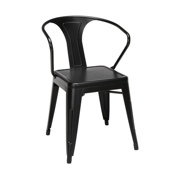 The 161 Collection blends mid century modern and industrial modern styles with current design trends to create timeless pieces that will seamlessly complement any decor. The OFM 161 Collection Industrial Modern 18" Mid Back Metal Dining Chairs with Arms, 4 Pack, are manufactured with galvanized steel for indoor and outdoor use. These stacking metal chairs come fully assembled and are welded together for added strength. The use of anti-UV powder to prevent heat retention make these dining chairs a great solution for outdoor spaces like cafes, bistros, pubs, or your own backyard. The mid back arm chairs feature extra wide seats, an x-brace beneath the seat that provides additional support and stability, measure 22.5" D x 20.0" W x 30.9" H, and hold at least 250 lb of weight. The metal surface makes cleaning easy and the plastic non-marring protective floor glides help prevent sliding and scratching. These chairs have been tested to light commercial-grade standards. With our 5 Year Limited Warranty, these patio chairs bring substance and style to any space.