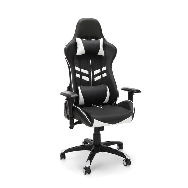 The Essentials by OFM Model ESS-6065 Racing Style Gaming Chair has a 180 degree reclining back angle adjustment. Its additional swivel/tilt control is manipulated with tension adjustment. This gaming chair has adjustable arm height and a folding base. The steel tube frame construction is ergonomically shaped to hold you in position. Also features adjustable lumbar and headrest pillow. Backed by our Essentials by OFM Limited Lifetime Warranty.