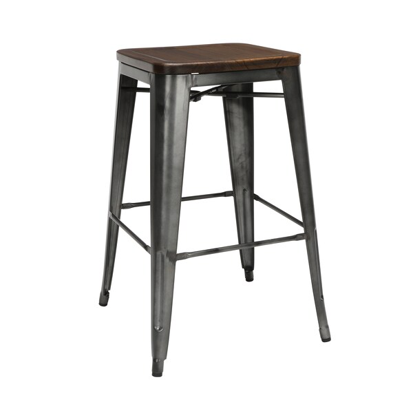 The 161 Collection blends mid century modern and industrial modern styles with current design trends to create timeless pieces that will seamlessly complement any decor. The OFM 161 Collection Industrial Modern 30" Backless Metal Bar Stools with Solid Ash Wood Seats, 4 Pack, require no assembly, are stackable, and provide a roomy 15 square inches of seating surface. These bar height stools are perfect for covered outdoor applications with their galvanized steel construction and anti-UV powder that prevents heat retention, keeping these stools cool to the touch even in full sun. While the style is clear, these stools have ample substance and structure too with an x-brace beneath the seat and a square foot ring that provides stability and a place to rest your feet. This set of 4 bistro stools feature a smooth Gunmetal finish to the metal and a solid ash wood seat in a warm Walnut finish. They are easy to clean and feature plastic, non-marring protective floor glides. These retro stools hold at least 300 lb and measure 20.0 D x 20.0 W x 30.0 H. Tested to light commercial-grade standards and covered by a 5 Year Limited Warranty, these stools will grace your floor, whether patio, kitchen, or bar, for years to come.