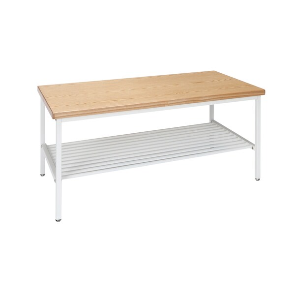 The 161 Collection blends mid century modern and industrial modern styles with current design trends to create timeless pieces that will seamlessly complement any decor. The OFM 161 Collection Industrial Modern Wood Top/Metal Frame Coffee Table with Metal Shelf blends easily in living rooms, recreational spaces, lobbies, and reception areas and provides the perfect place to rest your coffee cup. The brightness of the Natural tabletop finish pairs perfectly with the strong matte White metal frame for the perfect industrial modern touch to any room. A convenient metal rung shelf sits beneath the tabletop, waiting to store miscellaneous items as needed. Assembly for this coffee table is quick and easy and the materials used make cleaning simple. The table features adjustable leveling floor glides to help account for uneven flooring. The coffee table measures 39.4" D x 19.7" W x 17.7" H, holds up to 200 lb of weight, has a full BIFMA rating, and is backed by our 5 Year Limited Warranty.