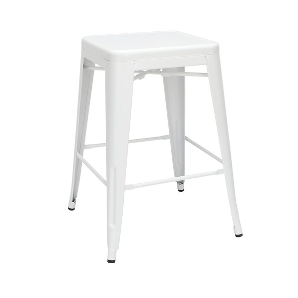 The 161 Collection blends mid century modern and industrial modern styles with current design trends to create timeless pieces that will seamlessly complement any decor. The OFM 161 Collection Industrial Modern 26" Backless Metal Bar Stools, 4 Pack, require no assembly, are stackable, and provide a roomy 15 square inches of seating surface. These counter height stools are perfect for outdoor applications with their galvanized steel construction and anti-UV powder that prevents heat retention, keeping these stools cool to the touch even in full sun. While the style is clear, these stools have ample substance and structure too with an x-brace beneath the seat and a square foot ring that provides stability and a place to rest your feet. The x-brace features anti-scratch protective stacking glides to prevent scratching from stacking the stools. These bistro stools are easy to clean and feature plastic, non-marring protective floor glides. These retro stools hold at least 300 lb and measure 19.5 D x 19.5 W x 26.0 H. Tested to light commercial-grade standards and covered by a 5 Year Limited Warranty, these stools will grace your floor, whether patio, kitchen, or bar, for years to come.