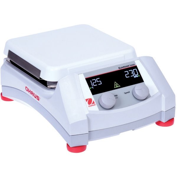 OHAUS Guardian 5000 Hotplates Stirrers are designed for safety and simplicity in all research, academic and industrial applications. The design ensures proper mixing and temperature control of the top plate or your sample when using the optional temperature probe. Heating models include a Single Point Calibration feature for multiple setpoints. Select from five models with three plate sizes for your everyday heating and stirring applications. An industry-leading early detection system that uses two independent safety controls to continuously monitor the electronics and shut off heating before an overtemperature condition occurs. Precise stirring from 60 to 1600 rpm is made possible by the design of a powerful motor, strong magnet and software controlled ramp rate, ensuring secure magnetic coupling for viscous applications. The bright LCD display includes large temperature and speed settings, intuitive icons and a prominent hot top indicator €“ all designed to quickly and easily monitor performance from across the lab.