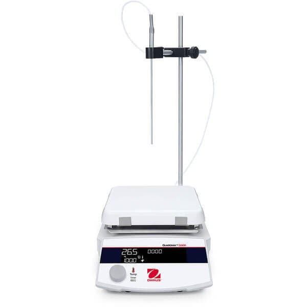 The Next Generation Guardian 5000TM Hotplate Stirrers are engineered for safety and versatility across research, academic and industrial settings. They offer powerful heating and mixing, with premium hardware and software to support diverse users safely and reliably. Heating models reach up to 550C and feature 3 temperature control modes for quick heating or precise heating without overshoot. Select from 5 models with 3 plate sizes.Applications: Temperature Sensitive Chemistry and Biology, Heat Fixation, Solution pH Optimization, Solution Sterilization, Endothermic Reactions, Denaturing of Organic Material, Sample and Solution Preparation, Dissolving Buffers and Reagents, Preparing Media, BoilingDisplay: High contrast brilliant LCD displayOperation: 100-120 VAC or 220-240VAC 50/60Hz power entry, rotary switch knobs controlCommunication: Ethernet Available as an Accessory;RS232;USB Available as an AccessoryConstruction: Robust full metal housing, ceramic square top plate or ceramic-coated aluminum round top plate, high performance SmCo magnetDesign Features: Large dip angle front panel for easy monitoring from a distance, smooth enclosure surfaces for easy cleaning, audible alarm, IP32 protection, rapid install splashing shield optionalFunction: HeatingPlate Construction: CeramicPlate Size: 7.0 inTemp. Range: Ambient + 5C 550CCalibration: Temperature Calibration 3 Plate/3 ProbeControl: DigitalDimensions: 4.56 in x 12.94 in x 8.69 in HxLxWNet Weight: 8.6 lbPower: 100V-120V 15A 50/60HzSafety Certification: CE;TUVTemp. Stability: +/-1% Plate, below 100C +/-1C and +/-0.5% Probe, below 100C +/-0.5CTemperature Probe: Pt1000Timer: 1 minute 99 hours, 59 minutesWorking Environment: 5C 40C, 80% RH, Non-condensingShipping Weight: 15.6555 lbsShipping Dimensions: 15.75 x 13.58 x 20.47Research or further manufacturing use only, not for food or drug use.