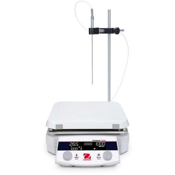 The Next Generation Guardian 5000TM Hotplate Stirrers are engineered for safety and versatility across research, academic and industrial settings. They offer powerful heating and mixing, with premium hardware and software to support diverse users safely and reliably. Heating models reach up to 550C and feature 3 temperature control modes for quick heating or precise heating without overshoot. Select from 5 models with 3 plate sizes.Applications: Temperature Sensitive Chemistry and Biology, Heat Fixation, Solution pH Optimization, Solution Sterilization, Endothermic Reactions, Denaturing of Organic Material, Sample and Solution Preparation, Dissolving Buffers and Reagents, Preparing Media, BoilingDisplay: High contrast brilliant LCD displayOperation: 100-120 VAC or 220-240VAC 50/60Hz power entry, rotary switch knobs controlCommunication: Ethernet Available as an Accessory;RS232;USB Available as an AccessoryConstruction: Robust full metal housing, ceramic square top plate or ceramic-coated aluminum round top plate, high performance SmCo magnetDesign Features: Large dip angle front panel for easy monitoring from a distance, smooth enclosure surfaces for easy cleaning, audible alarm, IP32 protection, rapid install splashing shield optionalFunction: Heating and StirringCapacity: 22 LPlate Construction: CeramicPlate Size: 10.0 inTemp. Range: Ambient +5C 500CSpeed Range: 50.0 rpm 1800.0 rpmCalibration: Temperature Calibration 3 Plate/3 ProbeControl: DigitalDimensions: 4.65 in x 15.84 in x 11.28 in HxLxWNet Weight: 14.8 lbPower: 100V-120V 15A 50/60HzSafety Certification: CE;TUVSpeed Stability: +/-2%Temp. Stability: +/-1% Plate, below 100C +/-1C and +/-0.5% Probe, below 100C +/-0.5CTemperature Probe: Pt1000Timer: 1 minute 99 hours, 59 minutesWorking Environment: 5C 40C, 80% RH, Non-condensingShipping Weight: 26.019 lbsShipping Dimensions: 21.26 x 14.17 x 26.77Research or further manufacturing use only, not for food or drug use.