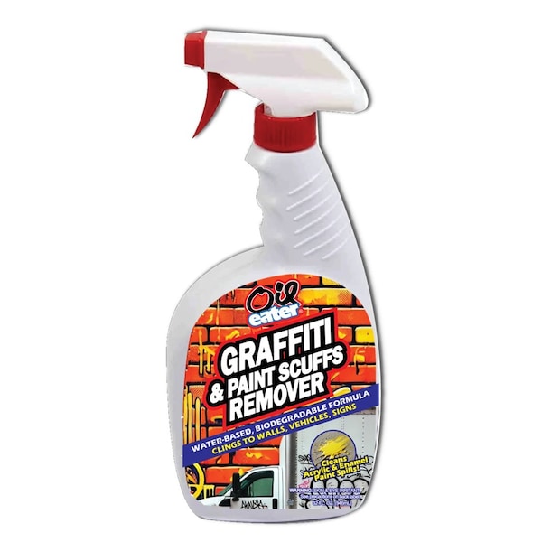 Graffiti Remover, Container Type Trigger Spray Bottle, Container Size 32 oz, Cleaner Form Liquid, Fragrance Unscented, Product Label Graffiti and Paint Scuff Remover, Biodegradable Yes, Butyl Free Yes, Color White, Nonflammable Yes, Primary Chemical Benzyl Alcohol, Ethylene Glycol Mono Butyl Ether, Triethanolamine, Properties Biodegradable, Removes Graffiti, Paint, Rinse Required Yes, Surfaces for Use On Brick, Concrete, Floors, VOC Content 28 Percent