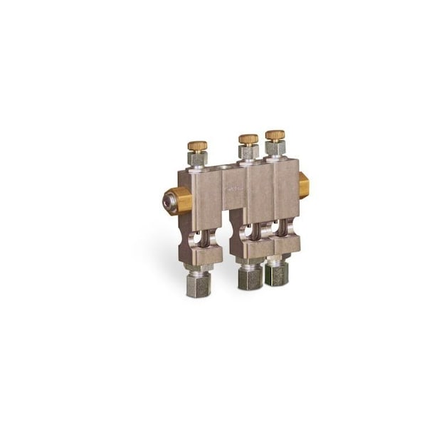 Item # B3150-103, Multiple Sight Feed Valve, Solid Gasket, 3 Valves, 1/8 Female NPT Inlet, 3 1/4 OD Tube OutletsMultiple Sight Feed Valves allow visual observation of the liquid stream, with the volume of flow controlled by an adjustable precision control needle valve. These units are especially suitable for lubricating inaccessible spaces and widely separated points. They are principally used on gravity or pressure lubricating systems in a variety of industries such as chemical mining, paper, agricultural, marine, woodworking, and textile. The sight feed valves can also be used to lubricate equipment like pumps, compressors, machine tools, bearings, seals, punch presses and rollers. Their use can be extended to any application requiring adjustable, visible flow control .The simple-to-use modular design allows the compact unit to be changed by stacking valves together. Additional valves are readily available part no. B3151-01B12GW .The sight feed valve is suitable for temperatures up to 225° F. The valve sight chambers withstand up to 125 PSI inlet to orifice pressure. The solid gasket design is used with a sealed pressure system vented designs are also available. The valves feature an aluminum alloy valve body, glass sights, Buna-N seals, and a 1/16 diameter port .A pipe plug is provided on each end of the unit. The end fittings can be removed and replaced on the outermost valves if additional valves are attached. There is a central 1/8 female NPT inlet, and each valve features a 1/4 OD tube outlet. Total height of the unit is 3 11/16 and total length is 3 3/4 .