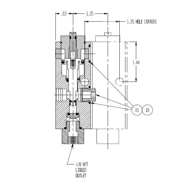 Item # B3338-1, Add-on feed for Air Operated PurgeX for Liquid, Buna-N Seals, 1 Feed PurgeX has the ability to deliver very small amounts of lubricant with each cycle and can be rapidly cycled for greater volumes; it is excellent for high speed applications. Precise volumetric delivery is achieved with the positive displacement design. There is no after drip, which makes PurgeX a very effective lubrication solution where product contamination is a concern. This PurgeX is operated with compressed air between 40 to 120 PSI. The body is made of anodized aluminum alloy, and the unit tolerates temperatures from -15° F to 180° F. Buna-N seals are used. The liquid delivery per cycle is adjustable between 0 to .012 cubic inches. The piston diameter is .250 and can travel as much as .250 per stroke. It has a 1/8 female NPT outlet. This is a single feed unit that is 2 in length and 4 in height. There is a 9/32 dia mounting hole. For applications with multiple feed points, internal Threadapter connections provide common air and lubricant lines for all PurgeX pumps in the same manifold. Each PurgeX in the manifold operates as an individual pump with a separate adjustment for lubricant delivery per cycle. It is easy to connect additional PurgeX pumps. Lubricant delivery can be completely shut off at any time by adjusting the piston to the fully closed position. The self-priming PurgeX will fill lines with lubricant automatically. A vacuum of 20-25 HG pulls liquid into the PurgeX chamber with each cycle. The piston ratio is 9:1, which converts inlet pressure from standard shop air into as much as 1,080 PSI at the outlet. Any entrapped air and other impurities are automatically purged from the system when the piston slightly over-travels the pump chamber with each cycle. The net result is the ability to reliably deliver an exact amount of lubricant. Additional requirements include a reservoir, 3-way solenoid valve, timer or sequence signal, and tubing and fittings. This unit is an add-on feed for B3162 series pumps with Buna-N seals.