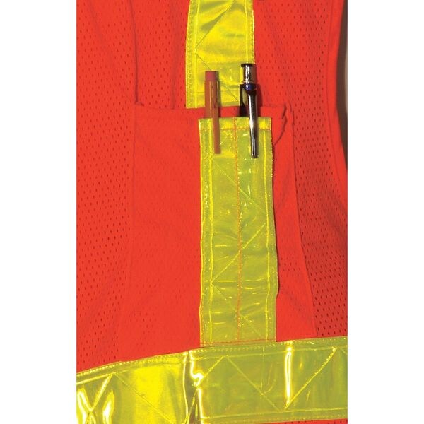Hi-Visibility Vest, ANSI Class 2, Vest Size M, Traffic Safety Vest Color Orange/Red, Fits Chest Size 26 In. to 38 In., Gender Unisex, Vest Material Polyester Mesh, Vest Closure Type Hook-and-Loop, Standards ANSI/ISEA 107-2010