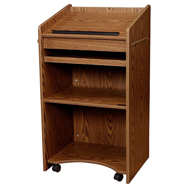 Lectern, Color Medium Oak, Mobility Mobile, Material Laminate, Overall Height 46 in, Overall Width 25 in, Overall Depth 20 in, Wattage Not Applicable, Voltage Not Applicable, Sound System Included Not Applicable, Includes Document Rail Yes, Shelf Width 23 1/2 in, Shelf Depth 18 in, Microphone Type Not Applicable, Includes Sound System No, Cabinet Depth Not Applicable, Cabinet Height Not Applicable, Cabinet Width Not Applicable, Caster/Glide Type (2) Locking, (2) Swivel