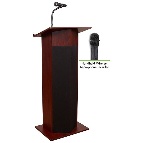 Sound Lectern, Color Mahogany, Mobility Stationary, Material Laminate, Overall Height 46 in, Overall Width 22 in, Overall Depth 17 in, Wattage 30 W, Voltage 117 V AC, Sound System Included Amplifier, Mounted Gooseneck Microphone, Clip-On Microphone, Wireless Handheld Microphone, Includes Document Rail Yes, Shelf Width 12 1/2 in, Shelf Depth 4 1/4 in, Microphone Type Handheld, Clip-On, Includes Sound System Yes, Cabinet Depth Not Applicable, Cabinet Height Not Applicable