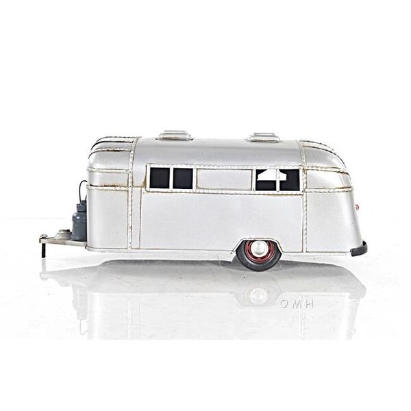 Camp in comfort with this detailed trailer hand painted in silver color. It has two propane tank, side door, windows, rolling wheels, tow hitch, license plate, and taillights. It's a terrific addition model for any trailer collection and a perfect gift for the trailer fans.