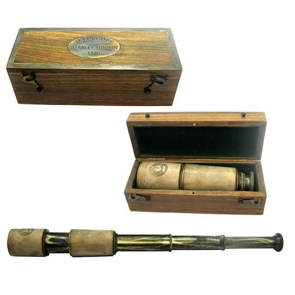 Our models have all the little details that would amaze you the moment you see them. Just look at them and you will highly appreciate not only the skills but also the time that our master craftsmen spend on each of these models. This hand held telescope is made of high quality brass. Each component is crafted with the finest craftsmanship. It comes with antique looking leather overlay that provides a rugged look and feel. Its available in antique brass finish and comes with a rosewood gift box. This is a great item to use and add to any nautical collection. The item dimensions are: L: 16 inches extended, W: 2.25, H: 2.25 inches.