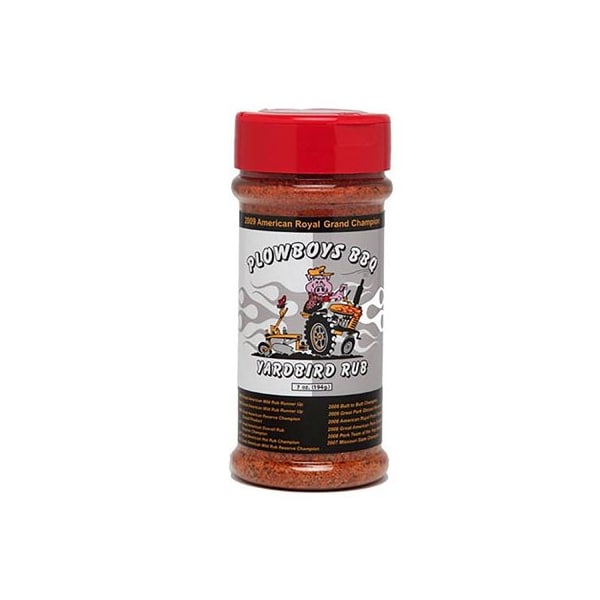 Plowboys BBQ 7 oz. Yardbird BBQ Rub. This savory rub has a touch of sweetness that is followed by a little heat. It is packaged in a shaker can.