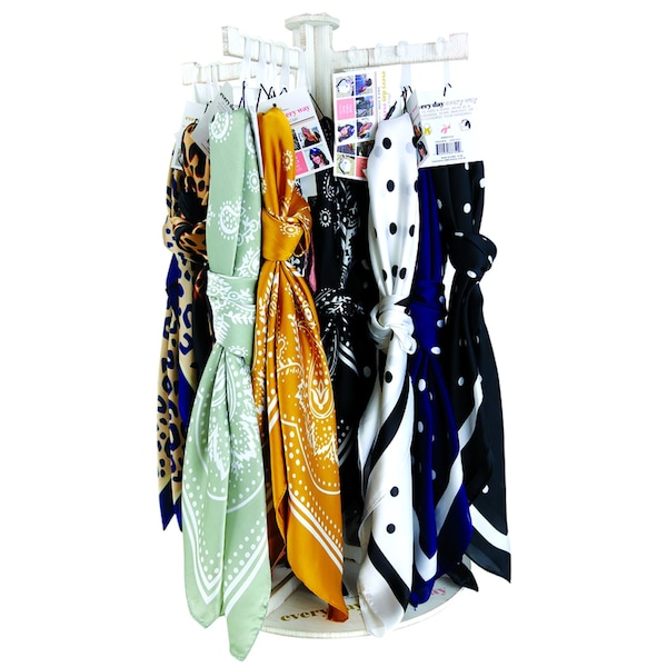 Accessorize effortlessly with the every day every way scarf. These trendy square scarves can be worn in your hair, on your purse or around your neck and come in a variety of prints and colors to match every outfit. Customers can choose from four shades each of paisleys, cheetah, checks and polka dots, all displayed on our boutique Olivia Moss counter display. Super smooth fabric stays cool and wrinkle-free for an elegant accessory that sells itself.