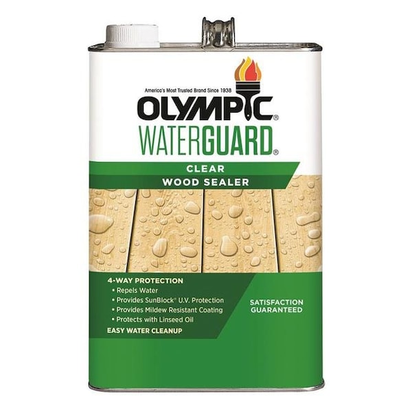 Olympic Waterguard Clear Wood Sealer. Less than 100 VOC, Acrylic resin. Low odor formulation that penetrates wood surfaces and protects against water damage, Provides a mildew resistant coating, sunblock UV protection, along with easy water cleanup. May be used on new wood, pressure-treated wood, weathered wood, and wood with a weathered, solvent-based, clear or semi-transparent stain. Recommended for use on exterior wood decks, fences, siding, railings, outdoor furniture and other wood surfaces. Coverage: 250-350 sq. ft. / gallon depending on wood texture.