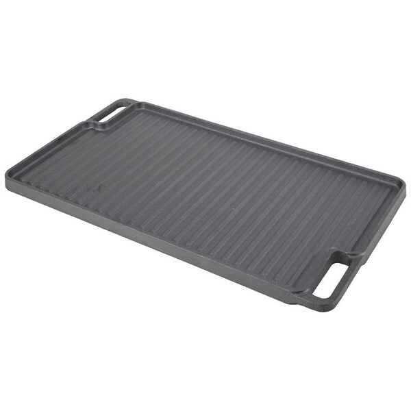 This grill plate has two reversible cooking surfaces and builtin handles for easy and secure lifting Size 1734 in x 10 in