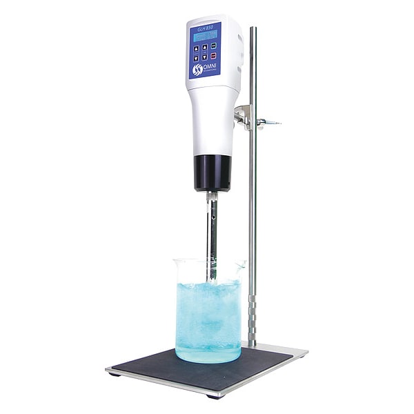 Homogenizer, Immersion, Volume Range - Homogenizers 200 mL to 5 L, Speed Range 5,000 to 25,000 rpm, Voltage 100/120V AC, Watts 850 W, Plug Style - Lab Equipment Standard, HP 1.2 hp, Material Stainless Steel (Probes), Max. Viscosity 5,000 cps, Noise Reduction Rating NRR 72 dB, Overall Height 8 1/2 in, Overall Width 10 in
