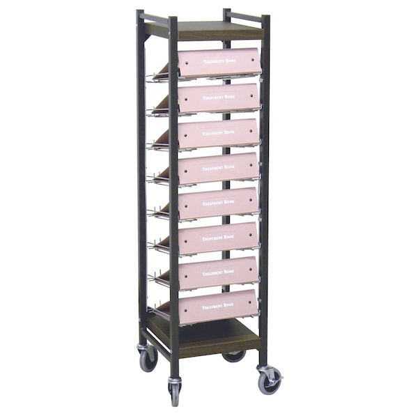 Welded steel frame and coated wire organizers. Organizers hold charts on slight angle for easy I.D. and retrieval. Racks have a universal design that allows storage of top and side chart binders in the same rack.