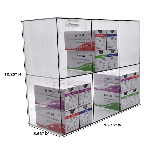 Omni med Suture Racks are constructed of an impact resistant acrylic that is 3/16" thick. These dual tier racks are top loading and have a front rail to keep boxes in place when retrieving suture packages. They have pre-formed keyholes for mounting and measure 12 1/4H x 15 1/2W x 5 5/8D.