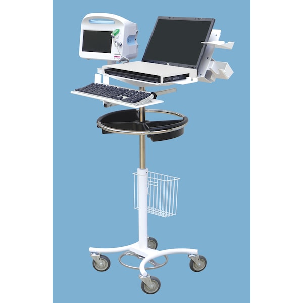 Omnimed Laptop/vital signs stands are constructed of heavy gauge steel that is powder coated for an attractive, durable finish. The unit has a 4-leg base with a low center of gravity and sturdy 4 inch rubber casters. The telescoping column has Pneumatic assist and extends from 36 H to 46 H for easy individual height adjustment. Carts have an adjustable 7 W x 19 L keyboard tray, left/right sliding mouse tray, easy access wheel ring handle with one Poly tray for storage and a removable basket ( 8 H x 10 W x 4 D) affixed to the column. The Laptop security head on the cart has scanner and mouse holders, a vital signs monitor holder and a 10' hospital grade retractable cord reel. It has 2 lock security for up to a 17 inch Laptop and a 120 degree backstop for Laptop protection. The back of the head assembly also has a welded compartment for cable storage.