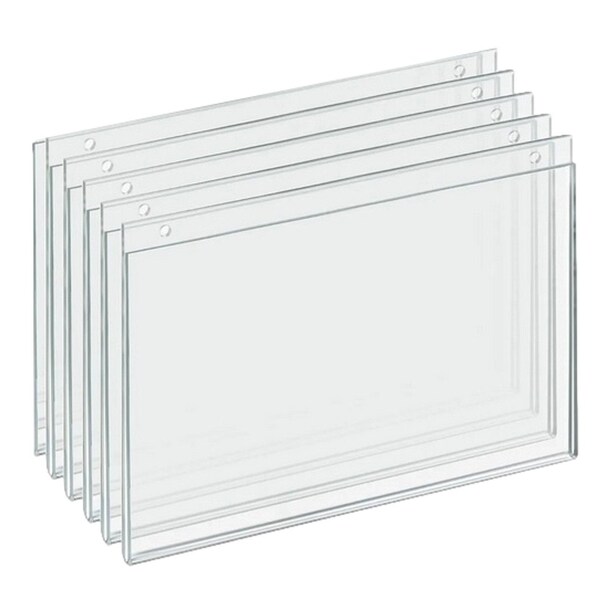 These clear acrylic wall-hanging sign holder frames are a versatile and affordable way to display everything from pictures and graphics to important documents and branding messages. Each pack includes 5 durable acrylic frames, complete with pre-drilled 0.25" diameter holes for easy hanging. The top/side-loading design allows you to quickly swap out your 11"x 8.5" inserts without even taking the frame off the wall. Forget taping things to your walls; these frame-less holders offer a sleek, modern look that complements any decor. They're perfect for showcasing business hours, advertisements, menus, gym schedules, artwork, or photos in a variety of settings, including retail shops, schools, hotels, offices, restaurants, and hospitals. Please note: Hardware is not included.