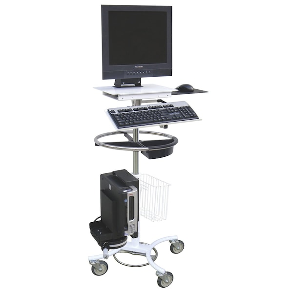 The Omnimed Security Laptop Stand is constructed of heavy gauge steel that is powder coated for a durable attractive finish. The laptop is secured to the work surface with a cover that has two-lock security and an adjustable keyboard tray underneath. The security top is mounted on a heavy gauge plated steel pole in a 5 leg base with 3 inch casters. The stand can be used sitting or standing. Vertical movement is controlled by operating the hand levers on both sides of the security top to adjust the height from 31 to 41 inches. A gas spring lift mechanism within the unit provides the smooth vertical lift. Stands measure 31-41 inches high by 21-1/2 inches wide and 14-1/2 inches deep. Its base has a diameter of 25 inches.