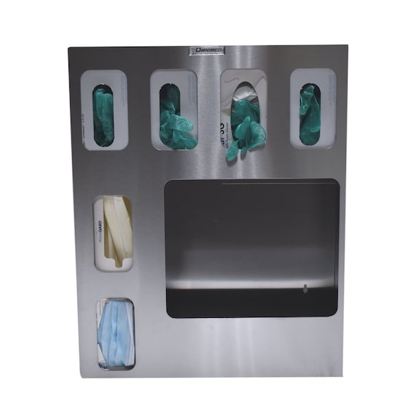 Steel isolation stations are constructed of durable stainless steel and spot welded for a sleek, easy to care finish that will withstand years of use and still look new. Our stations are designed to provide convenient, easy access to Person Protective Equipment (PPE) supplies where space is limited. They are ideal for use in any area where infection control protocols are in use. These stations are simple to load and can be mounted on a variety of surfaces. Each unit accommodates up to four different gloves sizes and two mask boxes as well as an area isolation gowns.