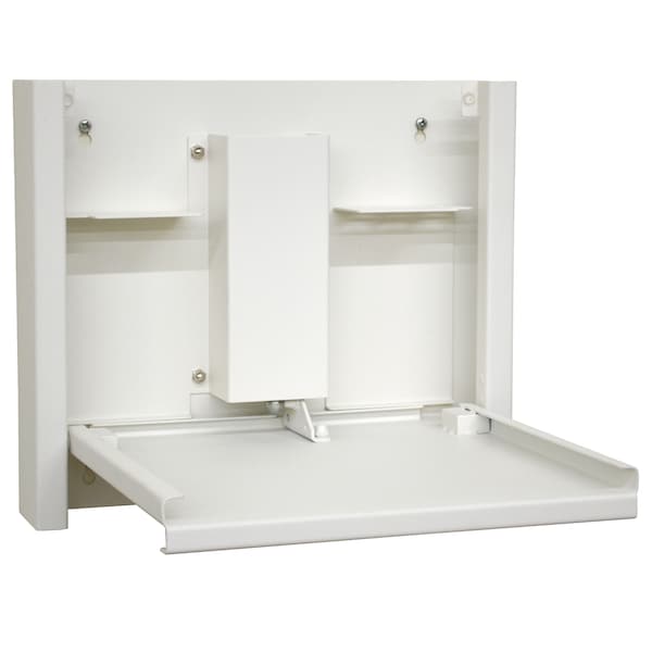 Omni med mini wall desks are constructed of durable off-white powder coated steel. Designed for small spaces, these attractive desks provide a convenient place to hold tablets or charts during examinations. The fold down desk door has a gas spring to ensure smooth opening and closing. Two small shelves, one of which has utility cutouts, are integrated into the back of the desk. These economical units measure 12HX 14WX 2 1/2D.