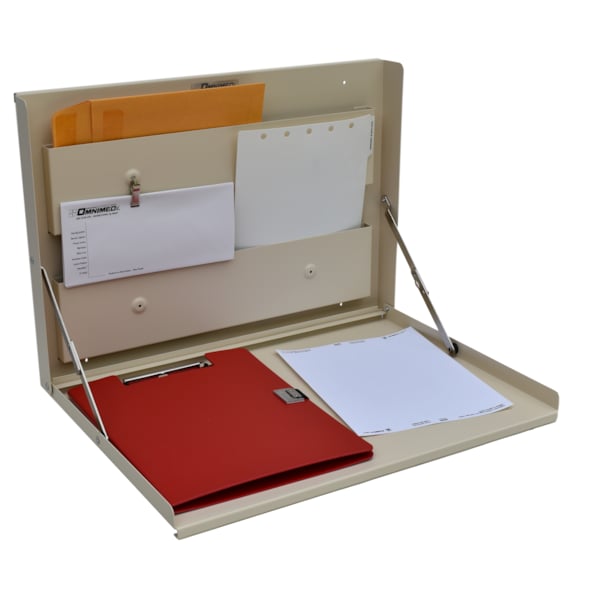 Omnimed standard wall desks provide durable, compact and convenient workspaces in any environment. These low-profile desks only protrudes 3 inches from the wall when closed and can be used in a standing or sitting position. The front panel offers a large work surface that smoothly opens and closes on strong metal folding hinges. Paperwork can be organized and secured in the 2 built-in pocket compartments on the back panel of the desk. Two beamatic clips mounted on the top compartment hold items securely and within immediate reach. These desks are available in anodized aluminum, Beige painted steel and stainless steel. Units measure 15H x 20 3⁄4W x 3D and have drilled holes for easy mounting.